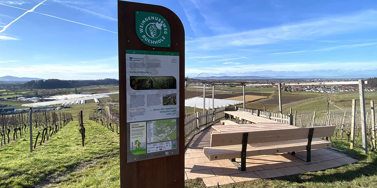 Die beiden Themenwege zum Wein- bzw. zum Obstgenuss sind so angelegt, dass sie separat, aber auch in einer einzigen größeren Tour erwandert werden können. Während der Weingenussweg in die Höhenlagen des Buchholzer Rebbergs führt, gelangt man auf dem Obstgenussweg durch die Anbaugebiete zwischen dem Ortskern und der Elz. Sie erfahren Wissenswertes zu Wein- und Obstbau, Geschichte, Klima und vieles mehr. Entlang der zumeist gut befestigten Rundwanderwege laden Ruhe- und Vesperbänke mit herrlichen Panoramablicken zum Verweilen, Ausruhen, Picknicken und Spielen ein.